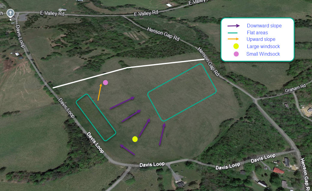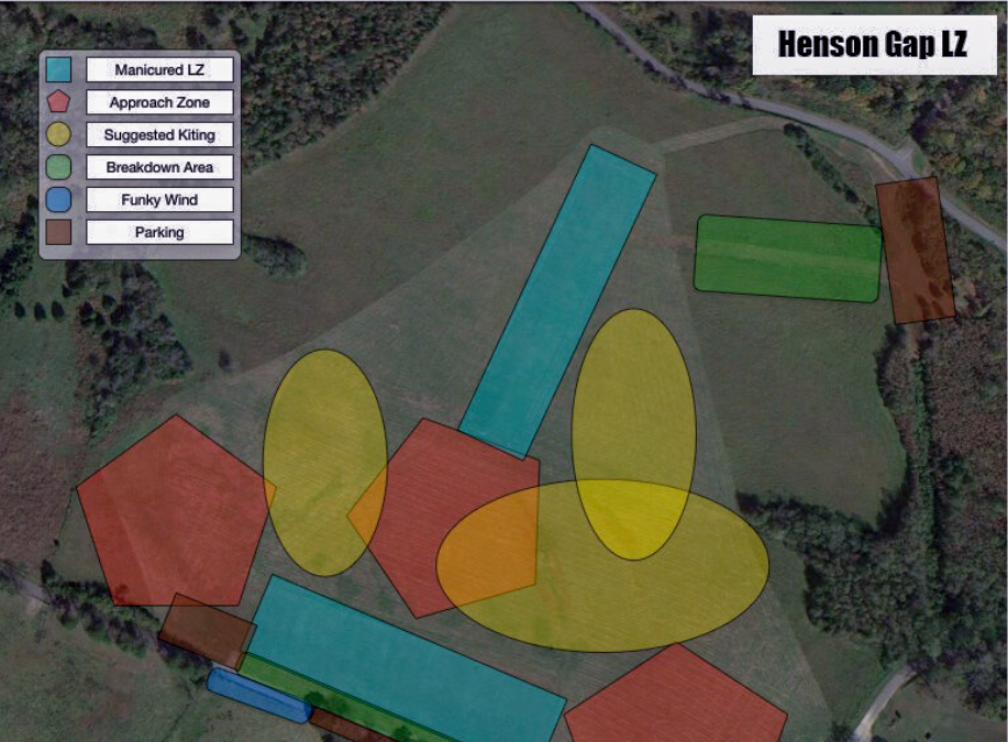 The Henson Gap landing zone (LZ) is located in the field north of Davis Loop and south of Henson Gap Road. View in Google Earth